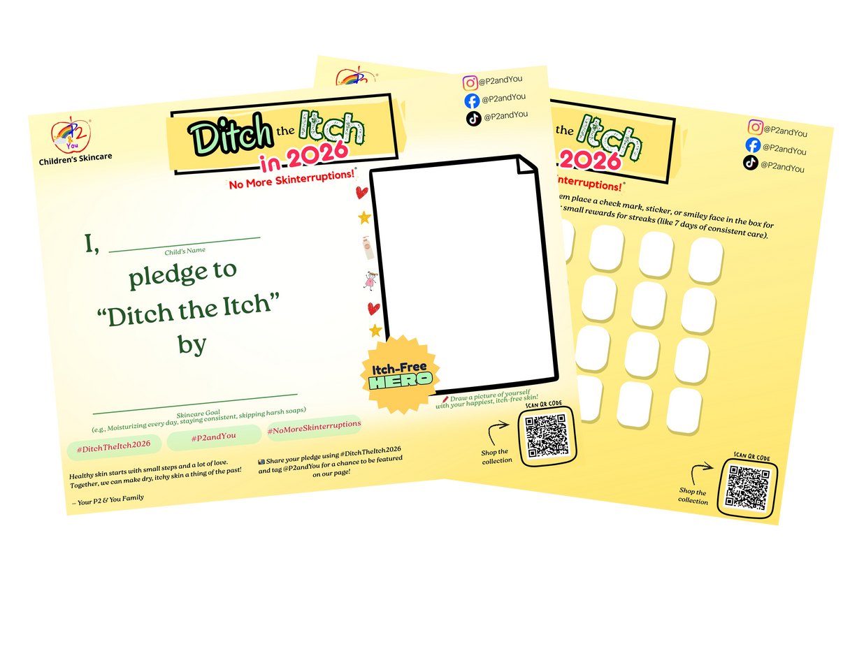 The Ditch the Itch in 2026 Printable Pledge is a fun, free downloadable activity created by P2 & You Children's Skincare, the gentle brand trusted by parents of children with dry, sensitive, and eczema-prone skin. Designed to help families take a hands-on approach to healthy skin, this printable lets your little one personalize their very own “Ditch the Itch”commitment for the year.